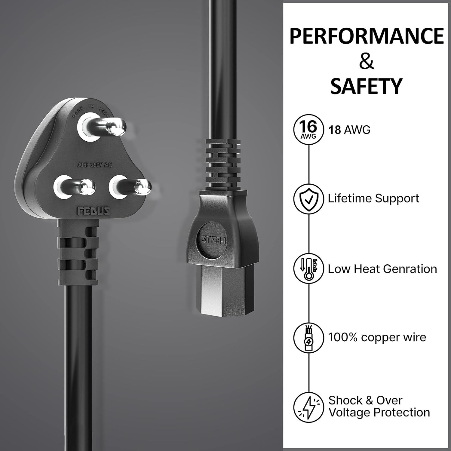 SAFETY: A rugged and durable cable ideal for everyday use. The BIS certified power cord is stress-tested for reliability, resilience, maximum safety, durability and long life. The thickness of PVC insulation prevents current leakage and breakdown of the cable, ensuring safe usage.
